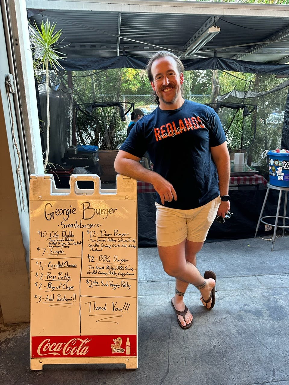 Georgie Burger can only be found on Thursday nights currently, but they are available to do any catering job, big or small. One of their first pop-ups was a friend's art show that they served 200 people at! They are available to private parties and catering with a little heads up. Dylan and his wife, Georgie, juggle their careers, being parents, and grilling up the best smash burgers in town.