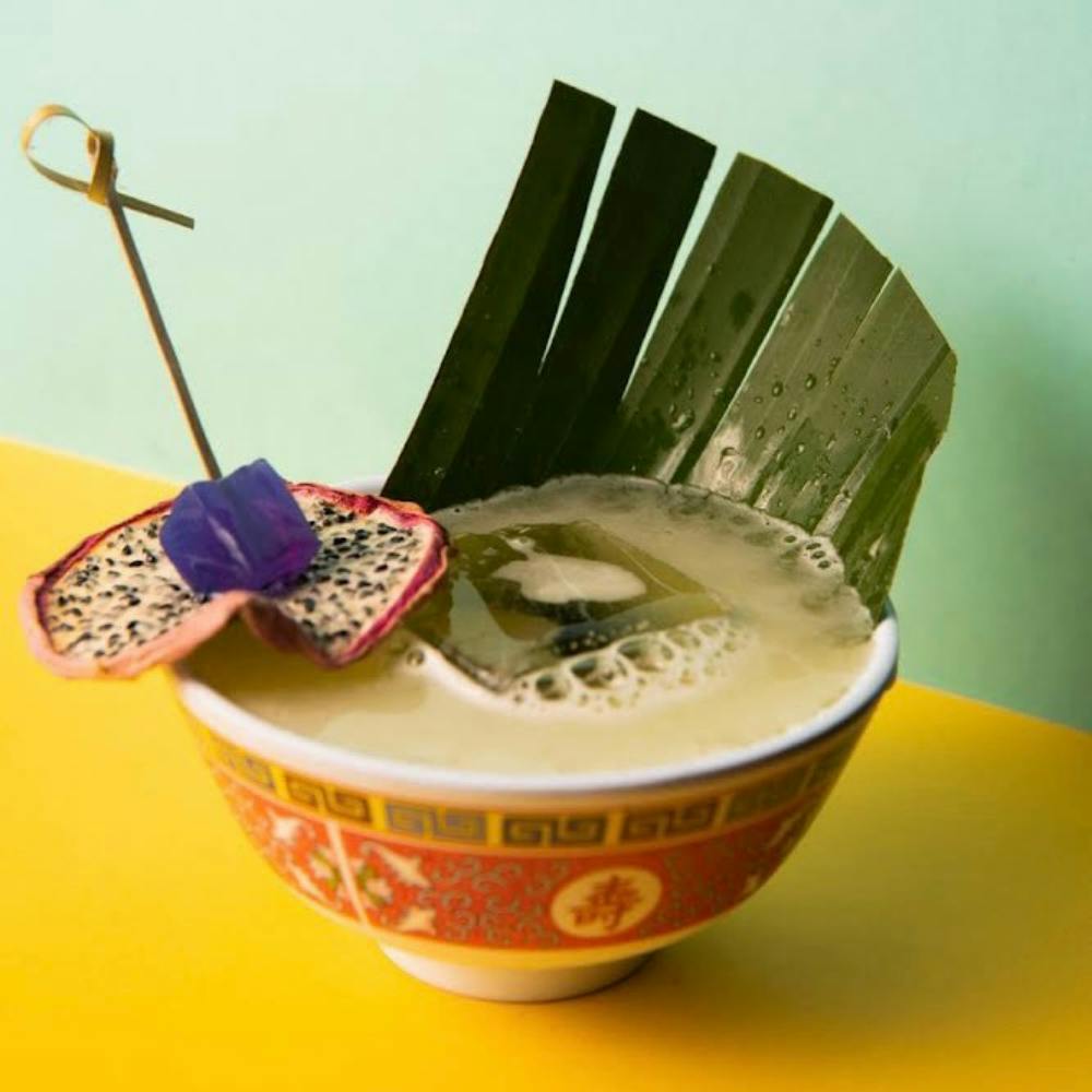 Sorry, Sorry, Sorry (picture 1): This little bowl of fun is one of their popular signature cocktails; it is the perfect size for one person and is meant to be drunk with both hands like if you were to sip miso soup. The banana leaf, dehydrated dragon fruit wheel, and the butterfly pea and coconut jelly square deliver a captivating presentation. This cocktail hits you with a variety of complementary flavors from the mezcal—subtle and sweet, not heavily peated—to the dryness of the resiling, to the sweetness from the pineapple, Suze, and bergamot, making this cocktail sparkling, bright and well-balanced. It is very approachable for people who are hesitant about mezcal.